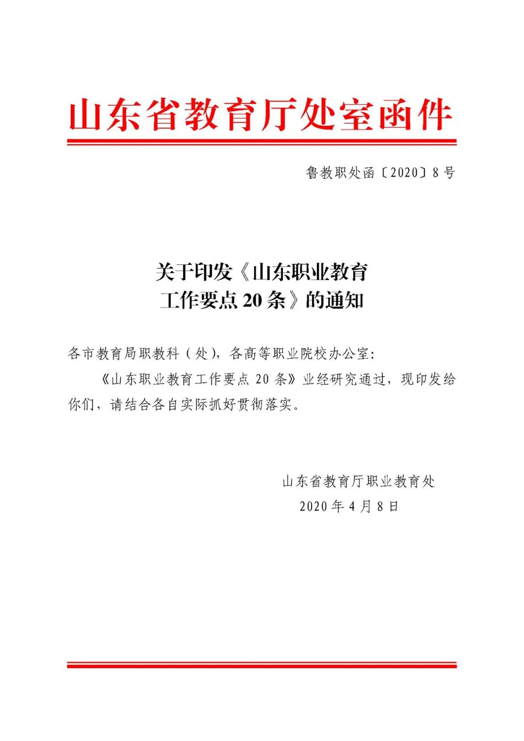 关于印发《山东职业教育工作要点 20 条》的通知《山东职业教育工作要点 20 条》业经研究通过,现印发给你们,请结合各自实际抓好贯彻落实。2020 年,全省职业教育工作的总体思路是:坚持以习近平新时代中国特色社会主义思想为指导,在全力抓好职教战“疫” 基础上,以部省共建国家职业教育创新发展高地为主线,将探索构建新时代中国特色职业教育制度和模式的责任使命,扛紧扛实扛牢,高起点开局起势,确保“一年成式”,为“两年成是”“三年成事”奠定坚实基础。1.省地共建省级职教创新发展试验区。遴选职业教育发展环境好、改革创新意识强的市、县(市、区),围绕不同领域、不同层面,省地共建职业教育创新发展试验区,支持青岛市、潍坊市建设职业教育创新发展示范区,支持德州市建设职业教育创新发展试验区。2.“一地(校)一案”创新发展职业教育。对照 45 项工作任务,对标全国一流、世界水平,逐项查找痛点堵点难点,科学确定探索突破点、规律切入点、发展着力点,创造性开展工作, 逐市、逐县(市、区)、逐校制定创新发展实施方案。3.遴选认定职教改革成效明显地方。遴选认定职教改革成效明显、具有示范引领带动作用的市、县(市、区),在试验区建设、高水平职业学校和专业(群)建设、现代职业教育质量提升计划资金和项目安排中予以倾斜支持。4.启动高质量发展三年行动计划。支持和推动各地、各职业院校研究制定规模与布局、专业结构、“双师型”队伍、实训基地、经费投入、社会培训三年提升行动计划,全方位提升办学要素水平。5.实施教学提质升级专项行动。启动新一轮规范办学行动计划。推进“三教”改革,修订专业教学指导方案,健全教材选用制度和教学用书目录,建设校企“双元”合作开发的省级规划教材,夯实课堂“主阵地”。做好 1+X 证书制度试点,联合有关部门制定 X 证书考核费用标准。6.建设高水平职业院校和专业(群)。重点建设 20 所左右高水平高职学校、50 所左右高水平中职学校和 50 个左右高水平中职专业(群)、50 个左右高水平高职专业(群),认定一批助力乡村振兴示范校。研究出台职业院校办学质量考核方案、专业(群)发展水平考核方案,不同学校不同特色,推进差异化发展。7.探索高职院校试办本科职业教育。编制本科职业教育试办学校和专业设置基本要求,在“双高计划”高职院校骨干专业试办本科层次职业教育。完善长学制培养模式,优化中职与本科“3+4”、高职与本科“3+2”贯通培养试点布局。8.在优质中职举办五年制高职教育。遴选优质中职学校,举办初中后五年制高职教育,建设集中职教育、五年制高职教育、技术推广、劳动力转移培训和社会生活教育为一体的职业学校。9.统筹抓好高职扩招工作。抓存量、找增量,确保质量型扩招,高中阶段应届毕业生以中职学生为重点,社会群体以退役军人、下岗失业人员、农民工、农民、在岗职工为重点,使城乡新增和现有劳动力更多接受高等教育。10.探索开放式、普及性大赛制度。承担全国职业院校技能大赛改革试点,坚持公益性、普惠性、开放性,以赛促学、以赛促教、以赛促改,逐步实现专业全覆盖、学生全参与、赛场全开放。11.落实职业院校育训并举职责。联合人力资源社会保障等部门,推动职业院校广泛开展企业职工、失业人员、高校毕业生、退役军人、农民工、去产能分流职工、建档立卡贫困劳动力、残疾人培训,全年培训 400 万人次以上。12.深度推进产教融合、校企合作。举办产教对话大会。联合工信、国资、财政、税务等制定政策,支持各类企业举办职业教育,推动校企新建一批专业、一批混合所有制二级学院、一批产教融合型企业、一批产教融合示范区(园)、一批技术研发和推广服务中心。支持济南市、青岛市建设国家产教融合试点城市。13.科学规划区域实训基地体系。推动实训基地建设与产业技术进步相适应,同步规划,适当超前布局,按照与校内实训基地互补原则,市场化运作、多渠道投融资、企业化管理,推动各设区市建设大型智能公共实训基地。支持枣庄市启动建设中国职业教育博物馆和职业体验馆。14.扩大职业教育国际交流合作。研究制定山东省扩大职业教育对外开放指导意见,支持济南市举办“一带一路”沿线国家职业院校高端论坛,支持青岛市举办世界职业技术教育大会暨展览会,深度推进合作德国职业教育计划,举办鲁台职业教育交流活动。15.配合完善“职教高考”制度。配合有关处室单位,统筹谋划春季高考、单独考试招生、贯通培养试点、五年制高职教育、专升本、技能大赛获奖选手免试等改革,真正考出专业性、考出技术含量,畅通职校学生学业晋升渠道。16.配合推动落实学校办学自主权。配合有关部门,推动落实学校人才引进、招考程序和标准、用人计划、岗位设置、内设机构、绩效工资、教师招聘等 7 项办学自主权,激发学校办学活力。17.配合改革教师培养培训制度。启动职业技术师范大学建设,分专业支持高水平院校举办职业技术师范教育本科专业点;支持山东师范大学、山东理工大学等高校培养职业教育师资。制定职业院校教师专业标准。18.支持建设职业教育研究智库。联合山东省教育科学研究院,支持山东师范大学成立山东省职业技术教育研究院,培养职业教育研究人才。建设一批职业
