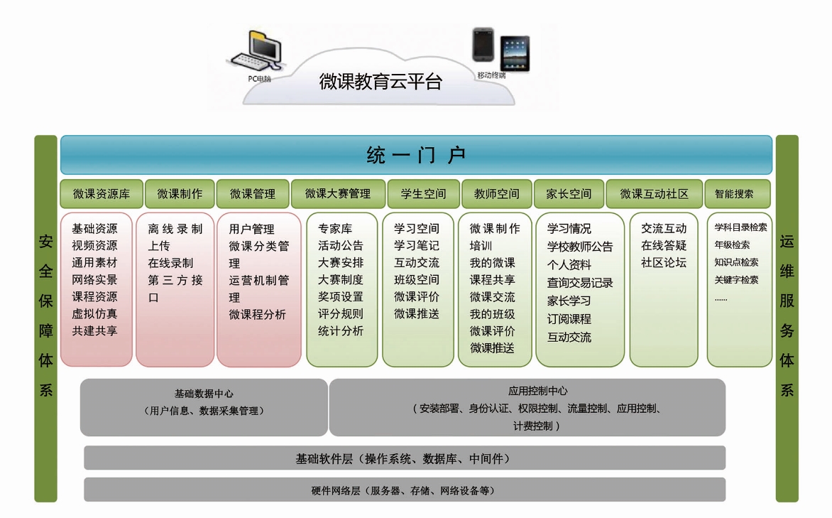 微课教育云平台涵盖了微课制作、管理、学习、交流、竞赛等内容。教师可以利用微课制作平台设计制作微课,分类管理微课;对优秀微课可以进行评价、共享、关注、收藏;同时还可以向微课竞赛平台推送优秀的作品参赛。学生通过微课制作平台,可利用学科目录、年级、知识点、关键字等多元检索,查找相应的微课进行学习;关注收藏优秀微课及教师,系统自动推送关注微课相关信息;同时还可以在《学习单》的指导下完成微课的学习和交流。