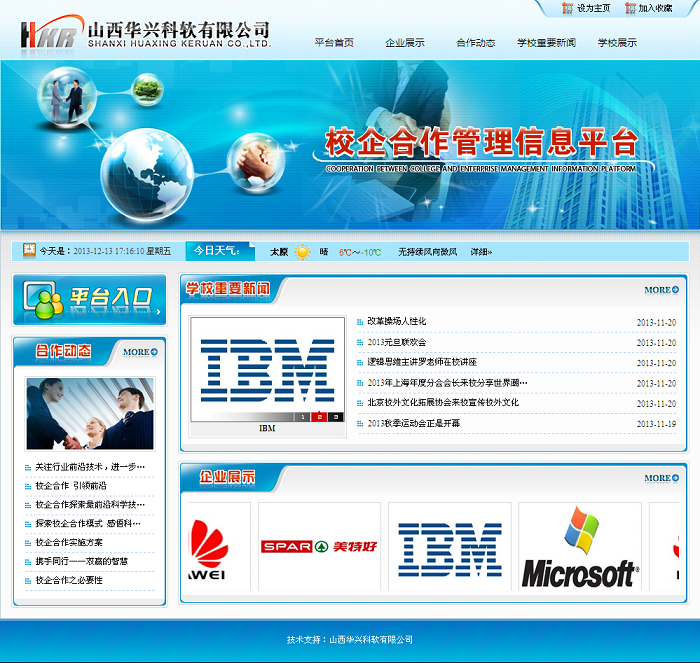 校企合作管理平台是为了学校通过企业反馈与需要,有针对性培养人才,结合市场导向,注重学生实践技能操作,培养出社会需要的人才。校企合作平台是突出一种“双赢”型平台,该平台着眼于“精细化培养,高位化就业”的目标,加强优势互补,实现互惠共赢。本着“以服务为宗旨,就业为导向,实现产学研相结合的校企合作模式”研发思路,实现了学校和企业的有机衔接,学校和企业的设备、技术实现优势互补,保障毕业生高效、畅通就业,校企合作良性发展。